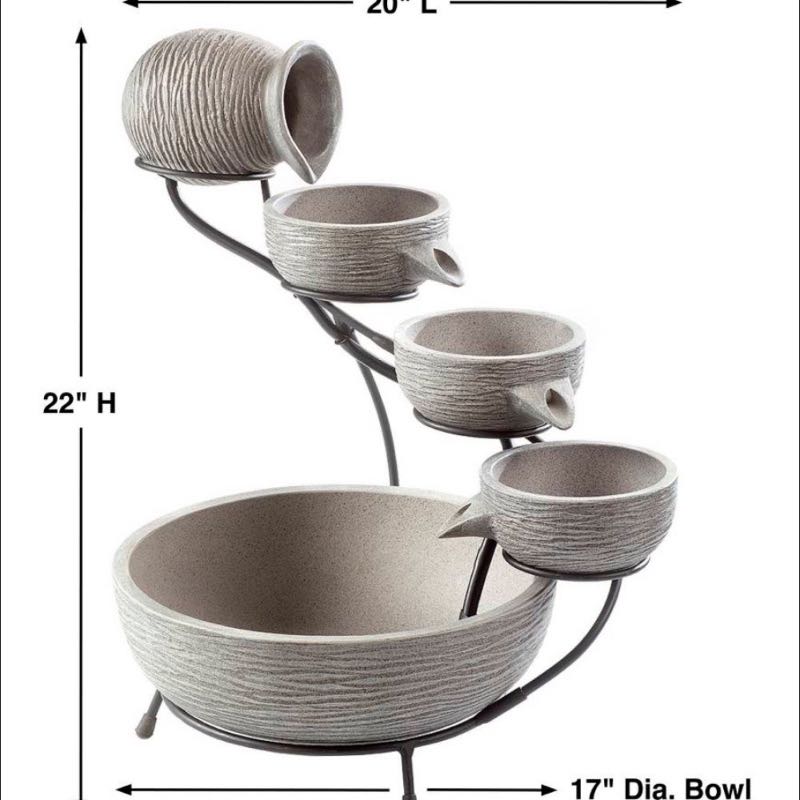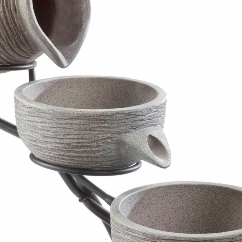Add the soothing sounds of gently cascading water to your deck patio or garden with the Oslo Dark Grey Solar Cascade Fountain. The remote solar panel (included) powers the pump so you can enjoy the fountain in the location of your choosing. Creates a relaxing atmosphere in a garden on a patio or on a balcony with this beautiful light concrete 4-tier cascading fountain. This solar-powered fountain uses a low voltage solar pump to constantly re-circulate water from its main bowl reservoir continually recycling the water. Operates in direct sunlight with minimal operating costs and has no hard wiring so that it can be simply installed and enjoyed.