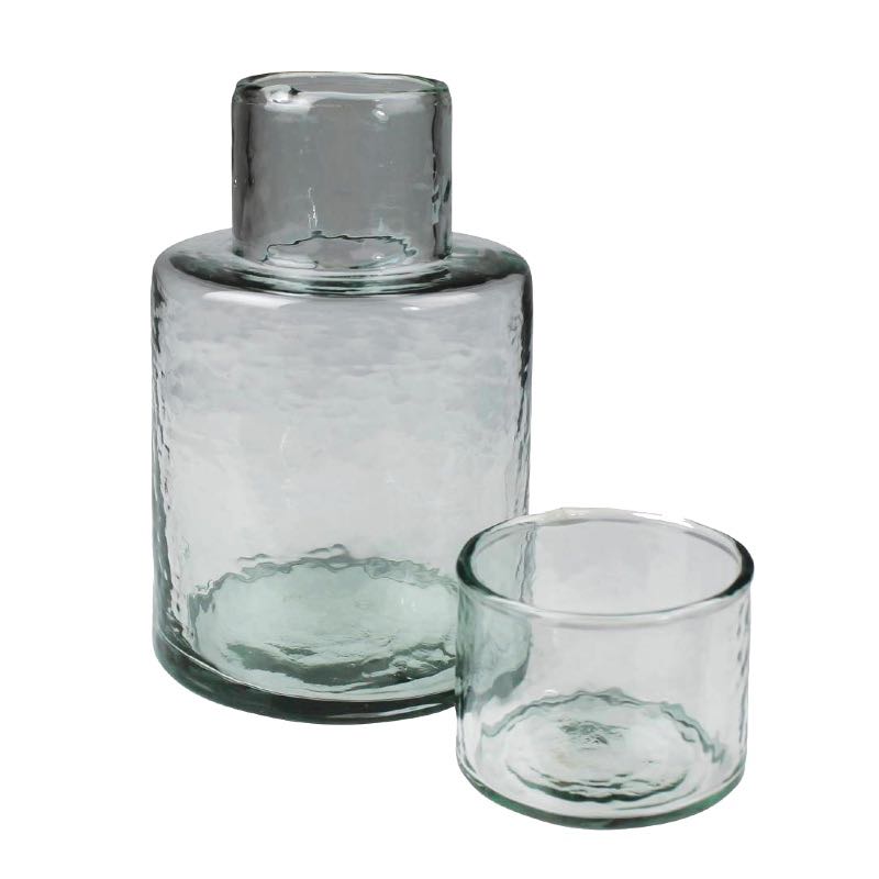Elevate your nightly ritual with the Palma Bedside Carafe, a harmonious blend of eco-friendly design and artisanal craftsmanship. Each carafe is handcrafted from recycled glass, ensuring that every piece tells its own unique story. Boasting a sturdy, thick glass design with a delicate hammered texture, this carafe doesn't just serve its purpose, it becomes an elegant bedside statement. Experience the tactile pleasure it offers, and marvel at its aesthetic beauty. Proudly made in India by our artisan partners.