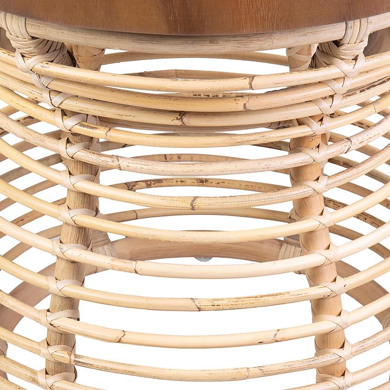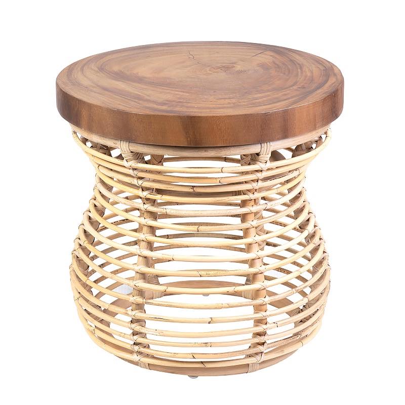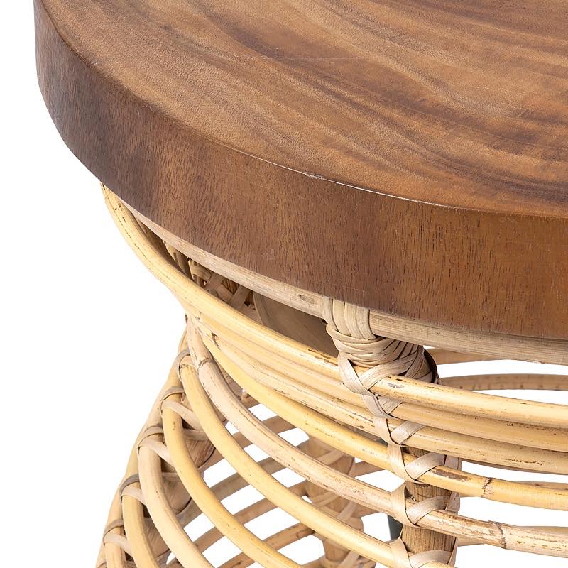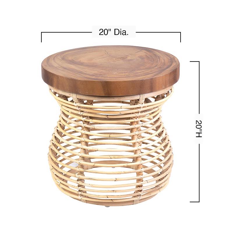The ideal piece for your growing plant collection the stack of books youve yet to get to or your evening tea. Naturally refined with a munguur wood top and a natural rattan base this stylish side table is durable yet chic. At a perfect 20" diameter and 20" tall it is ideal for smaller spaces that are looking to add an element of natural texture.