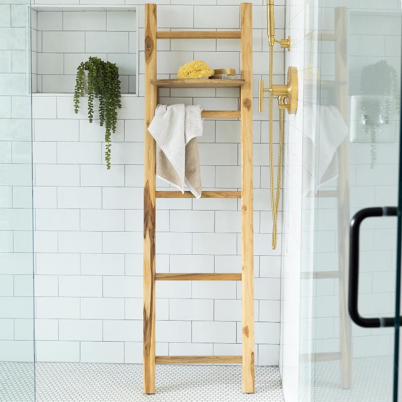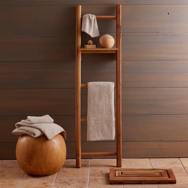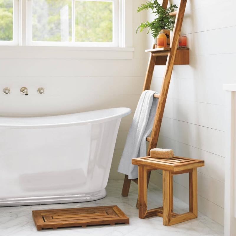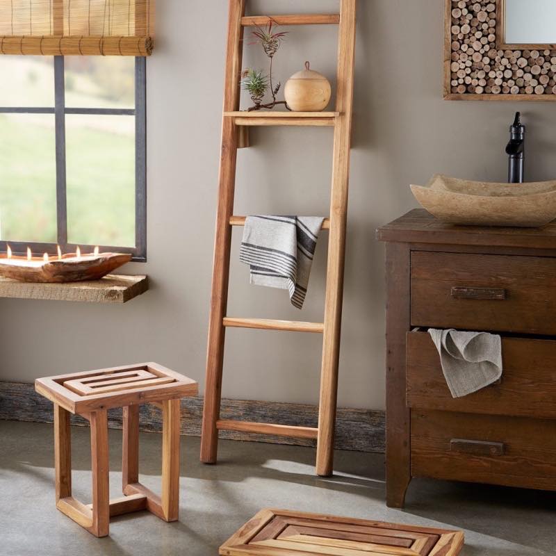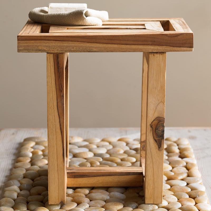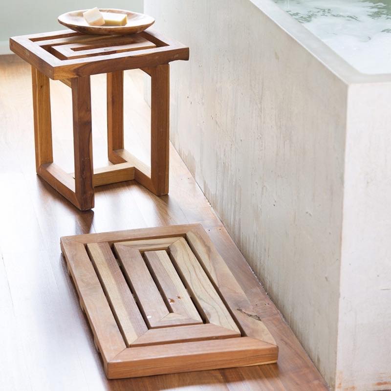 The teak in our handsome maze-design stool is grown on a plantation outside the rain forest to ensure that this endangered wood is not harvested in the wild. Ours is made from off-cuttings reclaimed from a furniture factory. An ideal bathroom companion dense teak sloughs off moisture with ease.