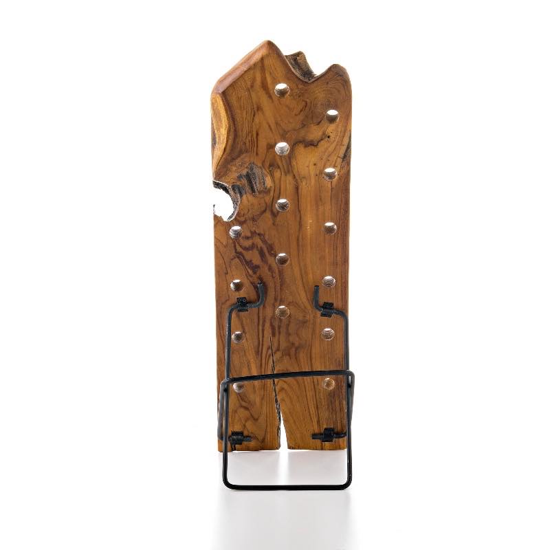 Add some sustainable style to your space with our gorgeous Reclaimed Teak Wood Wine Rack. Crafted out of a stunning piece of reclaimed teakwood and featuring a live edge the wine rack not only stores and displays your wine bottles it functions as an eye-catching piece of decor in your kitchen dining room or other indoor space. The teak wood makes an attractive display while the repurposed construction ensures your purchase is sustainable. The wine rack can hold 15 wine bottles and has a collapsible metal stand.
