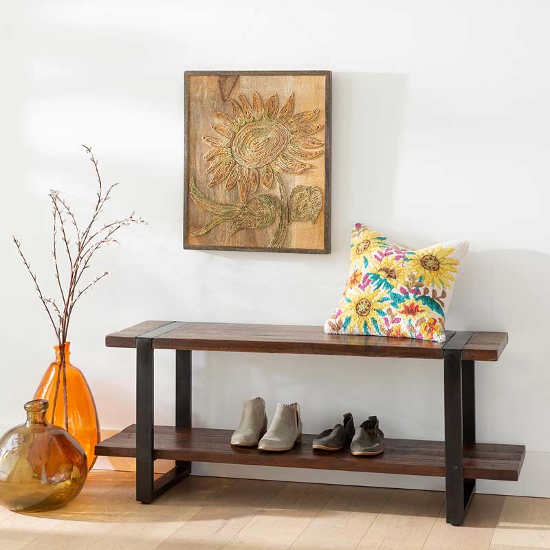 Beautifully crafted in India from iron and reclaimed wood, for a warm, rustic feel. Perfect for your entryway or mudroom, this bench features a 2-level design, allowing you to store your weather gear or shoes below.