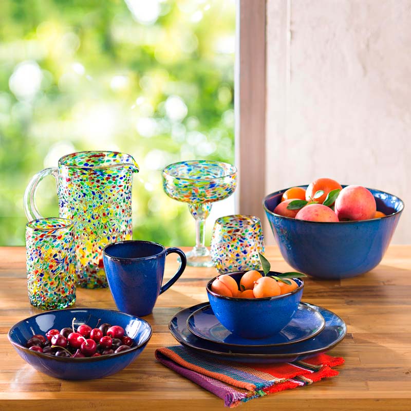 Transforming trash into treasure our set of four handcrafted Recycled Glass Confetti Tumbler Glasses are made using old soda bottles rescued from the landfill. Grace your table with an explosion of sparkling colors created by melting and artfully reforming the reclaimed glass.