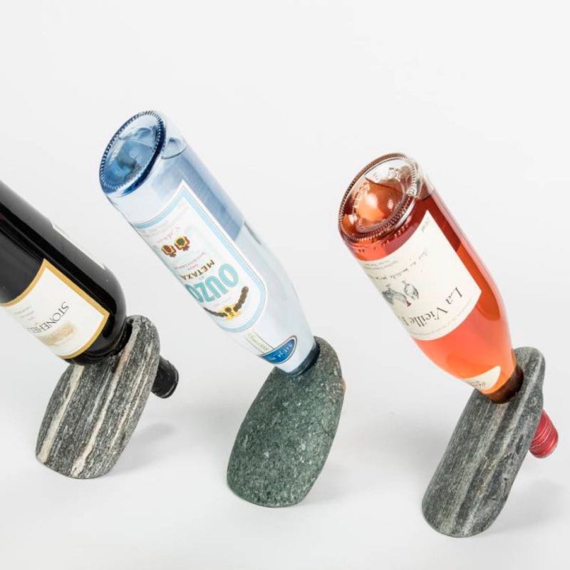 Our beach stone wine bottle balancer stores and displays your favorite wine in a clever counterbalanced design. Stones vary in shape size color texture and weight and may or may not have natural mineral deposits. Due to those variations the item pictured is an example only and will not be exactly what is received.
