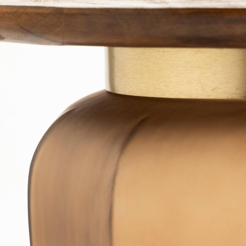 Meet the Robusto Frosted Glass Coffee Table, where sleek design meets craftsmanship. The frosted glass base brings a smooth, elegant vibe perfectly paired with a rich, mango wood top that's both stylish and functional. A striking metal brass band wraps around the neck, adding a pop of sophistication. Handcrafted in India by our talented artisan partners, this coffee table is a dynamic piece that effortlessly stands out in any space.