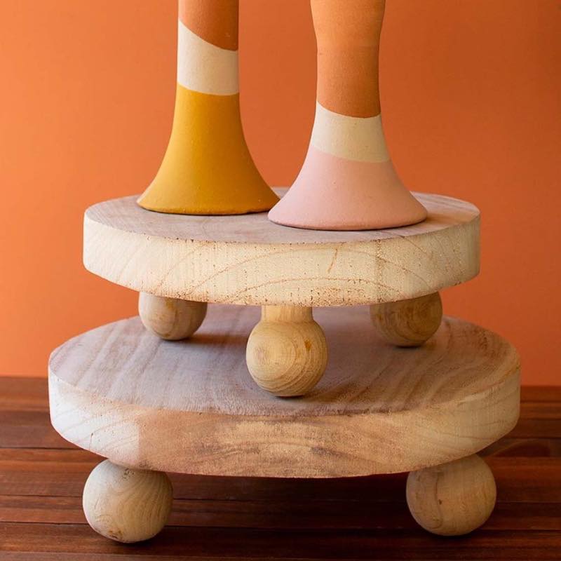 The natural finish and petite round ball feet of these Round Wooden Risers will add charming appeal without distracting from the decorative beauty of your display. These pedestal stands are the perfect plated cake stand cupcake stand or dessert display stands. Alternatively use them for plants or any decor item that needs a little elevation.