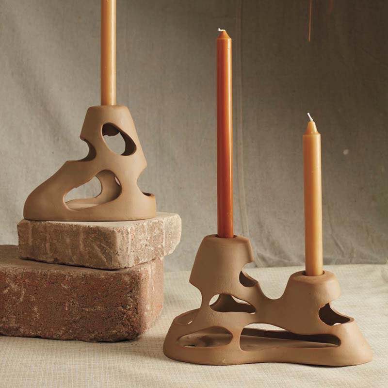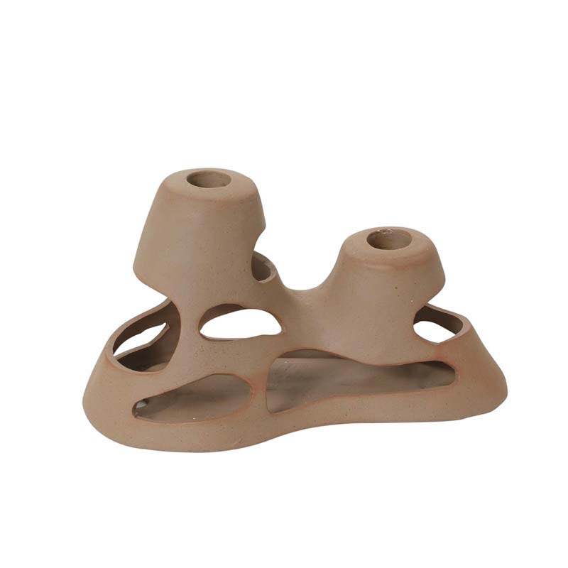 Capturing the essence of coastal tranquility, the Sandbar Candleholder boasts an organic design reminiscent of rock formations shaped by ocean waves. Expertly hand-sculpted from natural brown bisque clay, it features a unique texture that adds an earthy charm to any space. Equipped with metal spikes in each of its candle wells, this holder ensures taper candles stay securely in place. Not just a functional item, this candleholder serves as an exquisite sculptural element, enhancing the ambiance of your home with its serene natural beauty.