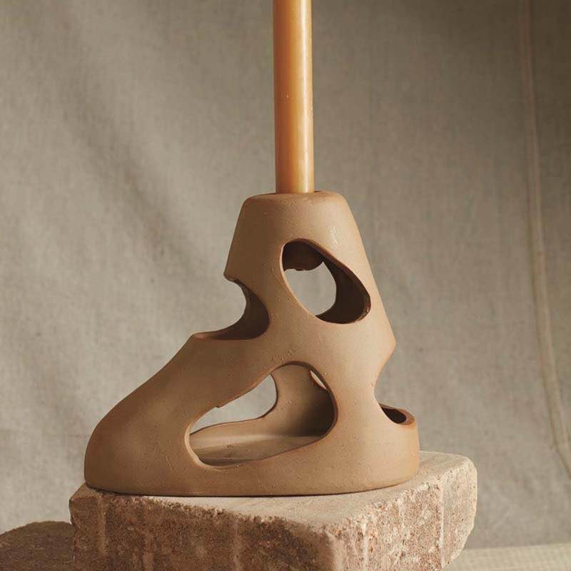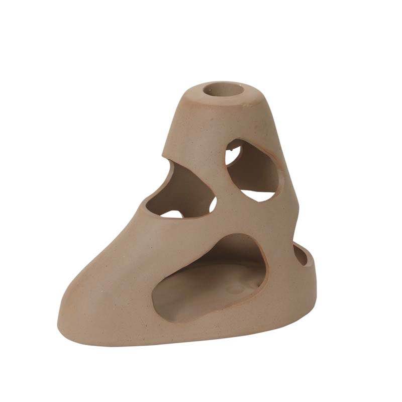 Capturing the essence of coastal tranquility, the Sandbar Candleholder boasts an organic design reminiscent of rock formations shaped by ocean waves. Expertly hand-sculpted from natural brown bisque clay, it features a unique texture that adds an earthy charm to any space. Equipped with metal spikes in its candle wells, this holder ensures taper candles stay securely in place. Not just a functional item, this candleholder serves as an exquisite sculptural element, enhancing the ambiance of your home with its serene natural beauty.