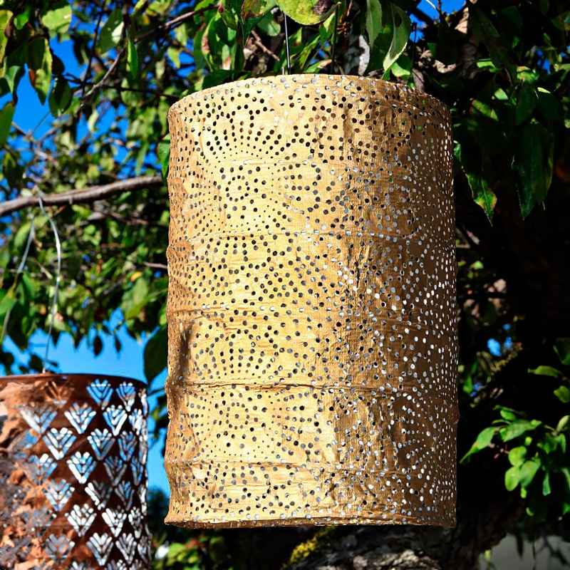 Reminiscent of tin art in a punched luminaria the Soji Stella Solar Lantern is a beautiful and unique way to dress up outdoor spaces. The metallic Tyvek fabric shines brilliantly during the day and a high-powered duel led emits captivating patterns of light by night. A cylindrical design and flat bottom allows for either hanging or tabletop use.