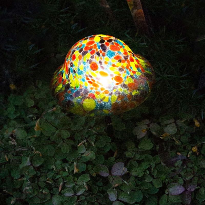 Each glass mushroom cap is hand-blown to ensure no two are alike. Inside the glass mushroom is an integrated bright white LED that illuminates whenever it gets dark so you can enjoy this treasure day or night.