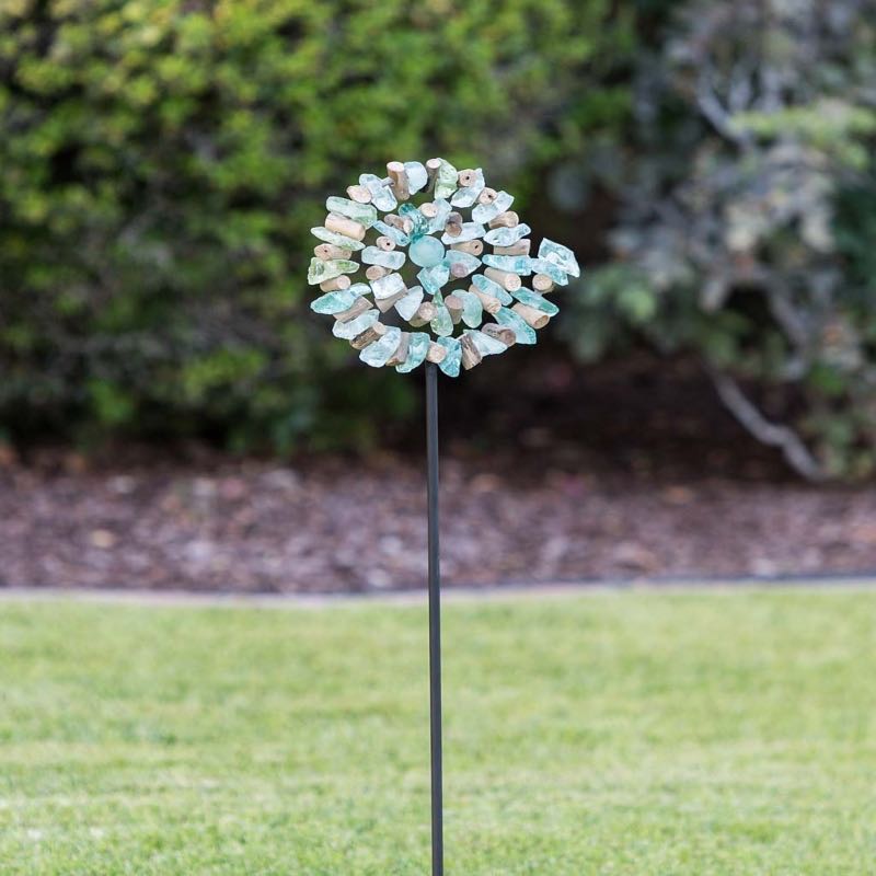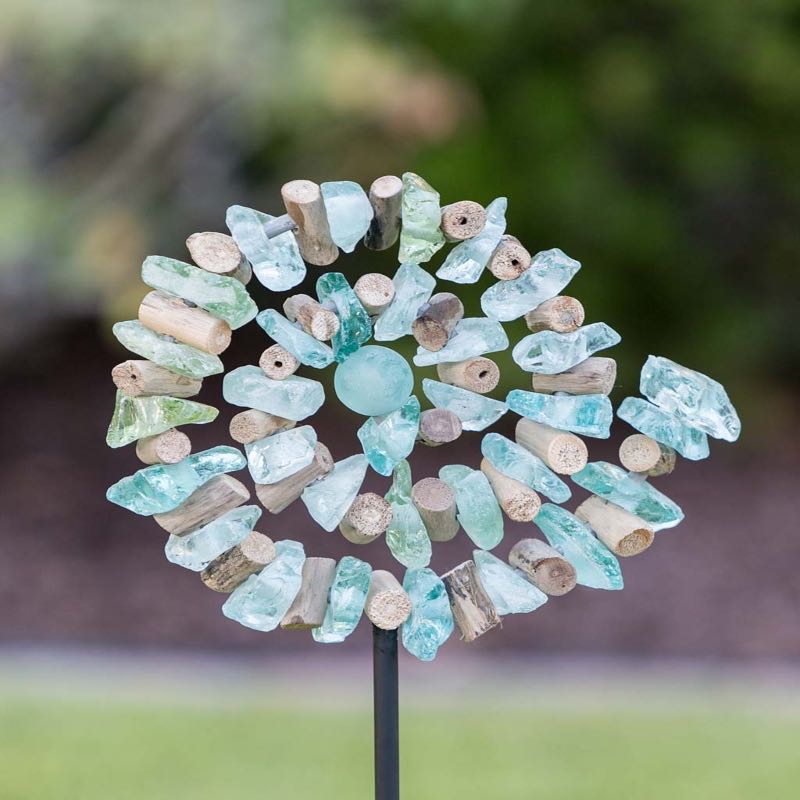 A picturesque mix of driftwood and recycled frosted glass forms an inspiring spiraled accent for your garden. The metal inner construction is a sturdy base for the glass and driftwood pieces arranged in a spiral design. At the center is an aqua glass sphere which has been hand-formed. Each sculpture is handcrafted and no two are identical. The ethereal design...read more