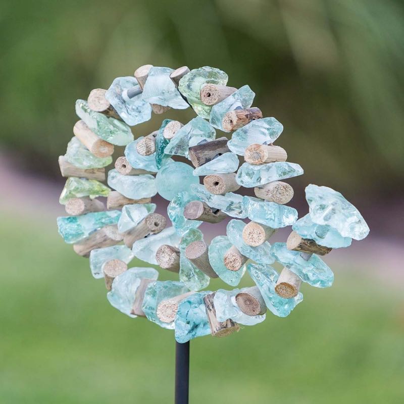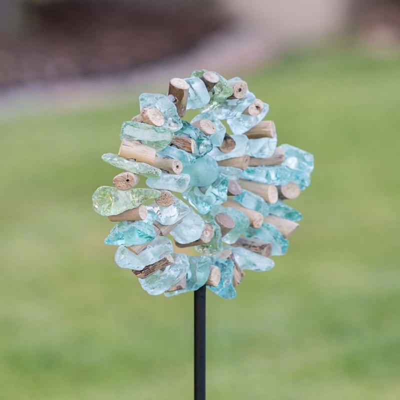 A picturesque mix of driftwood and recycled frosted glass forms an inspiring spiraled accent for your garden. The metal inner construction is a sturdy base for the glass and driftwood pieces arranged in a spiral design. At the center is an aqua glass sphere which has been hand-formed. Each sculpture is handcrafted and no two are identical. The ethereal design makes this sculpture perfect for outdoor setting.