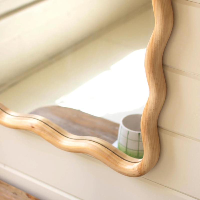 The Squiggle-framed mirror lends a unique element to your wall decor with its undulating design and natural wood construction. Featuring curved edges that add to its dimension this stunning versatile piece can be hung vertically or horizontally to best suit your space.