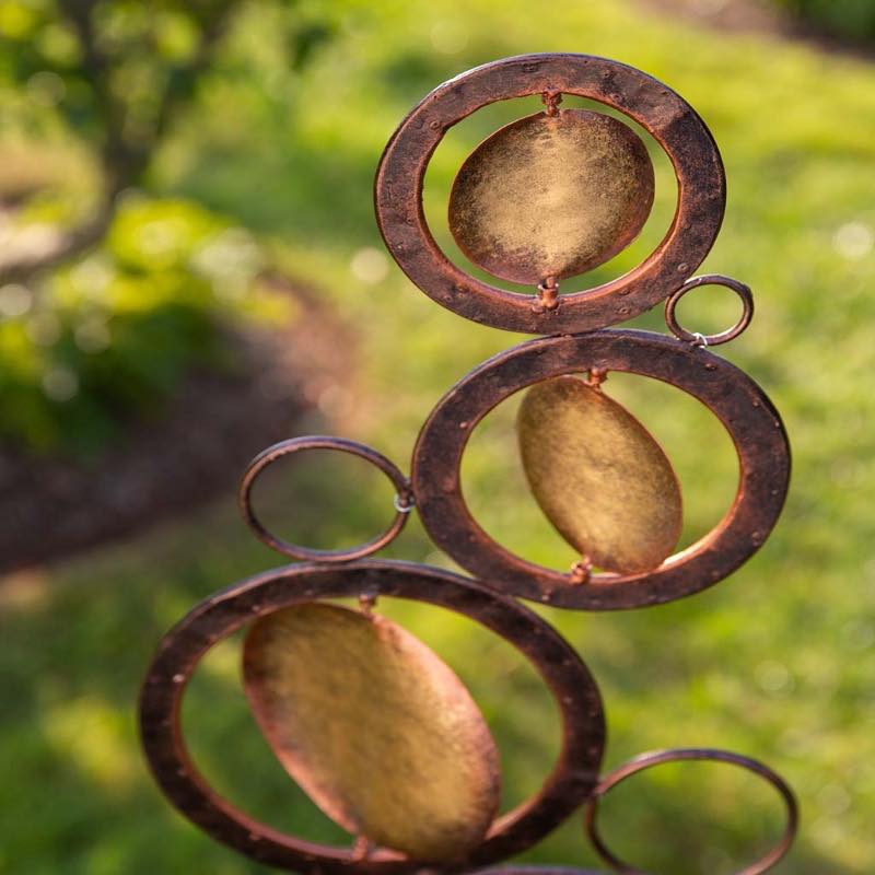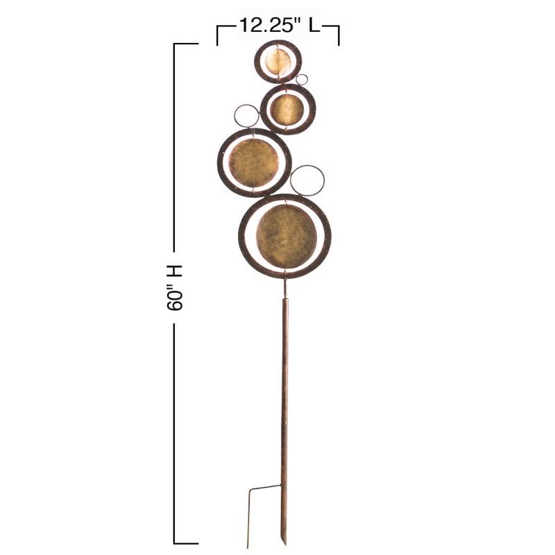 Create a unique focal point for any Zen garden, patio, or lawn with this exclusive handcrafted Stacking Orbs Spinner Stake. Distressed copper and gold-finish circles in varying sizes serenely spin in the wind, creating soothing motion and a relaxing visual display. Features an easy to place tripod stake. Our artisan-made recycled metal spinners and stakes allow for gentle steady interaction with the wind or adorning your garden, yet are durable enough to weather the elements.
