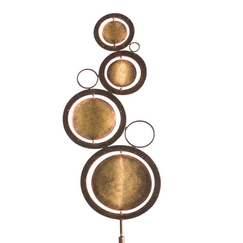 Create a unique focal point for any Zen garden, patio, or lawn with this exclusive handcrafted Stacking Orbs Spinner Stake. Distressed copper and gold-finish circles in varying sizes serenely spin in the wind, creating soothing motion and a relaxing visual display. Features an easy to place tripod stake. Our artisan-made recycled metal spinners and stakes allow for gentle steady interaction...read more