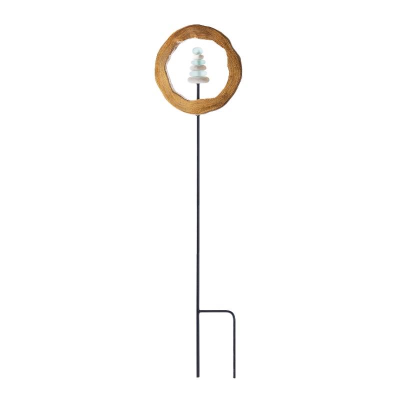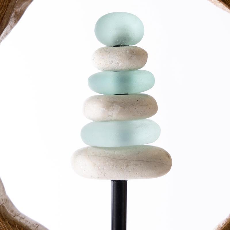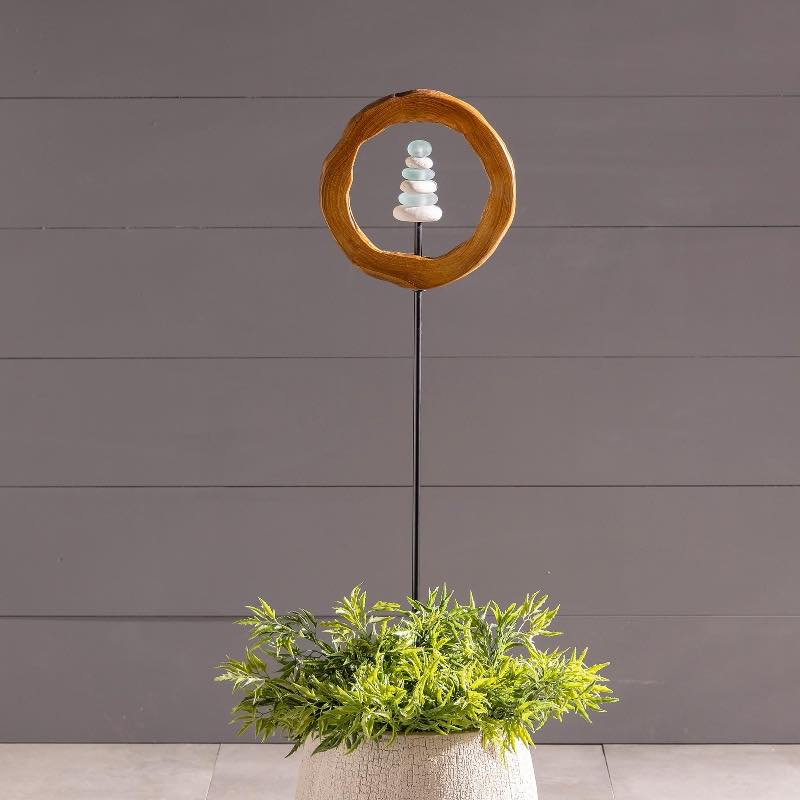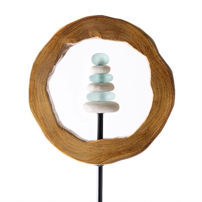Introduce serene elegance to your garden with our Recycled Glass and Rock Cairn Teak Garden Stake. This unique piece combines the natural beauty of teak wood recycled glass and smooth white stones for a captivating display. The teak wood ring encircles a carefully arranged cairn made from sandblasted glass and stones creating a harmonious blend of textures and materials.