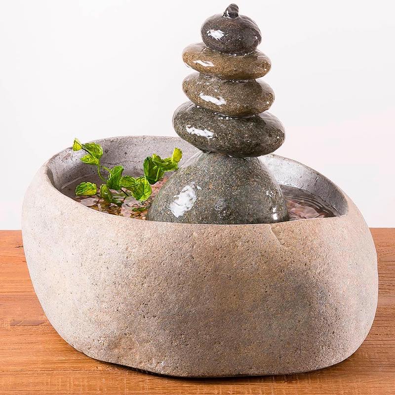 This Tranquil Rock Cairn Fountain features balanced stones (cairns) above a natural river stone basin in this tabletop fountain. Cairns or stone stacks have been utilized through the ages for everything from landmarks and trail markers to contemporary art. Many utilize the process of creating them as an act of meditation as they require great patience and focus to stack. Adding to the tranquil feeling emitted by this natural indoor accent is the subtle trickle of running water.