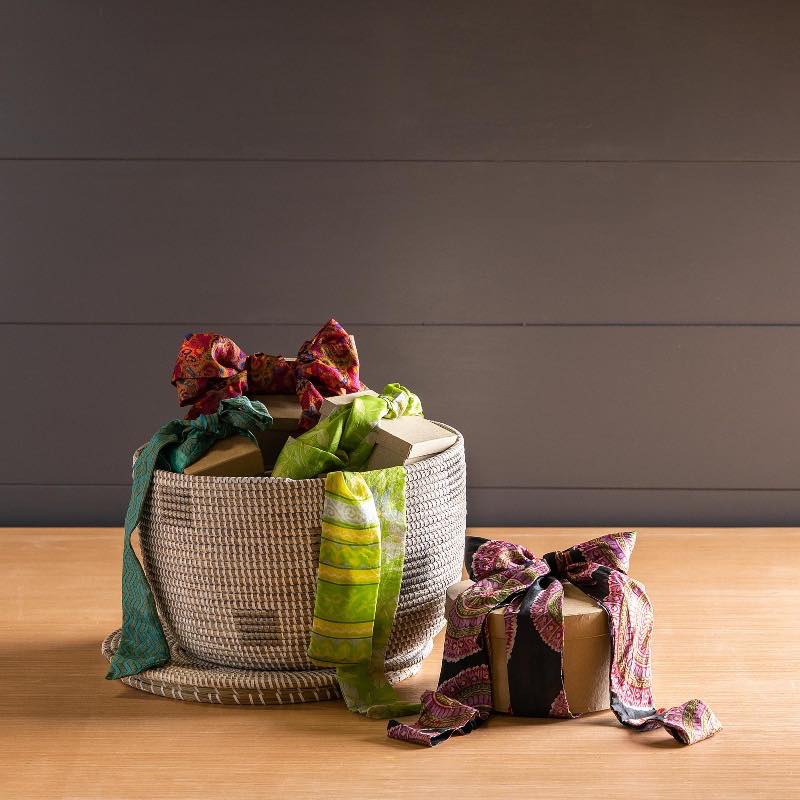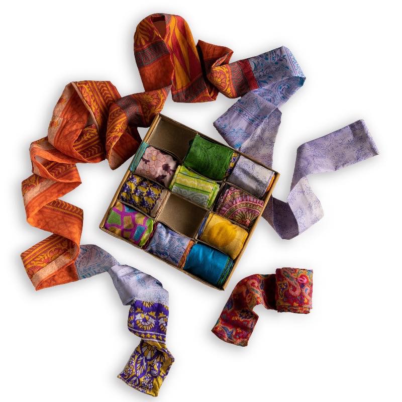Elevate the art of gifting with our Vintage Silk Sari Ribbon Set, a vibrant testament to sustainable luxury. Handcrafted from vintage silk saris, each of the 12 wide ribbons is a masterpiece in itself, resonating with rich histories and captivating tales.