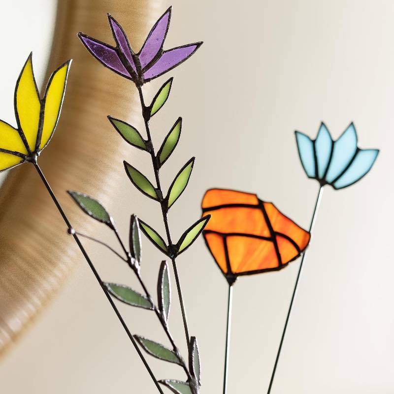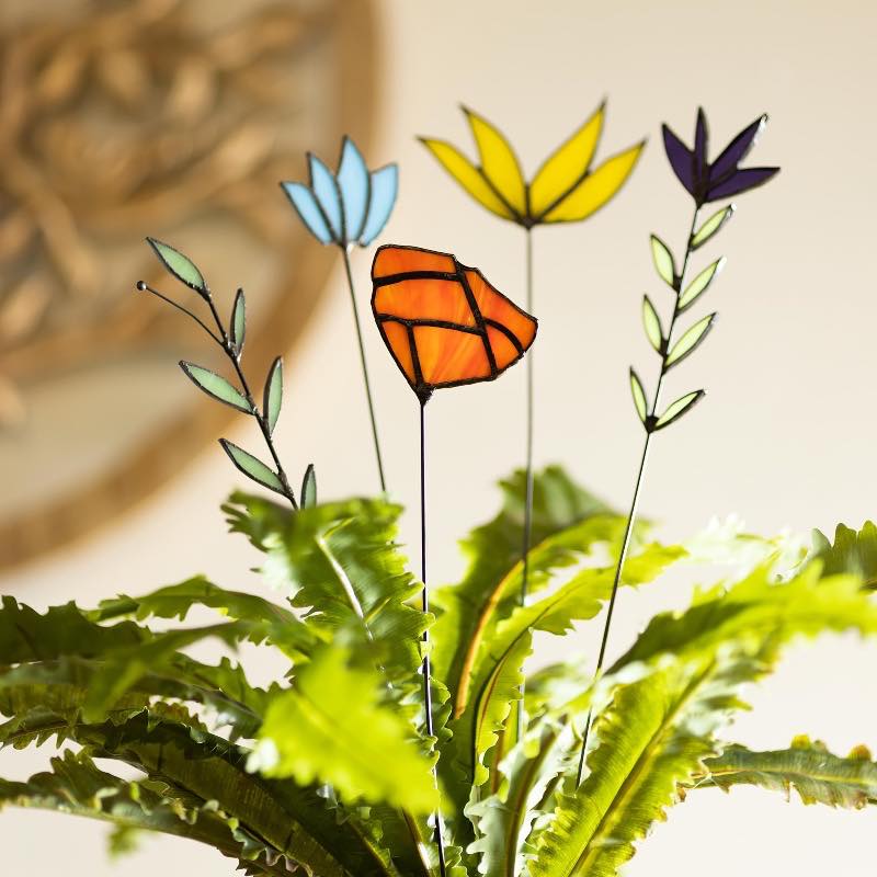 Casting vibrant shadows, these long-stemmed botanicals are handcrafted from colorful stained glass. Each stylized piece is inspired by florals the artist picks from the garden and adds dimension, texture, and color to a sunny spot in your space. Embellish a house plant or add to one of our signature balloon vases.